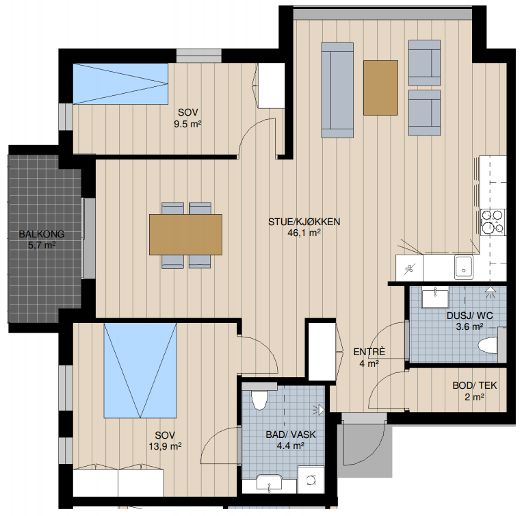 Denne leiligheten har panoramavinduer mot havna - og vestvendt balkong. Her kan virkelig utsikten til byen og byens havn nytes! Leiligheten er romslig, med åpen stue/kjøkkenløsning på ca 46 kvm. Hovedsoverommet har inngang til eget bad - og i tillegg er det et bad med inngang fra entre.