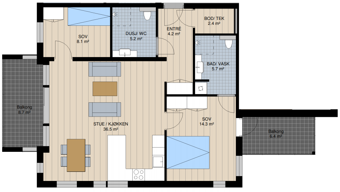 Romslig 3-roms leilighet med praktisk planløsning. Åpen stue/kjøkkenløsning med utgang til vestvendt terrasse. Leilighetens hovedsoverom har inngang til eget bad - i tillegg er det et bad med inngang fra entre.