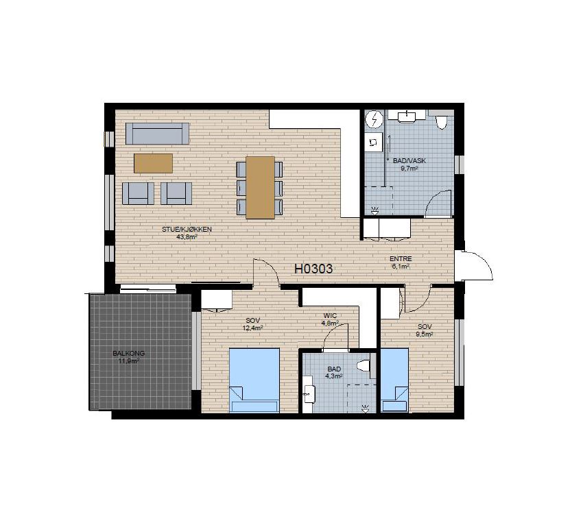 Stor 3-roms leilighet med vestvendt balkong - vendt ut mot fellesarealet. Stue/kjøkkenløsning på hele 45 kvm - med utgang til balkongen. Hovedsoverommet har både eget bad og "walk-in-closet". Bad/vaskerom og soverom 2 har inngang fra entre.