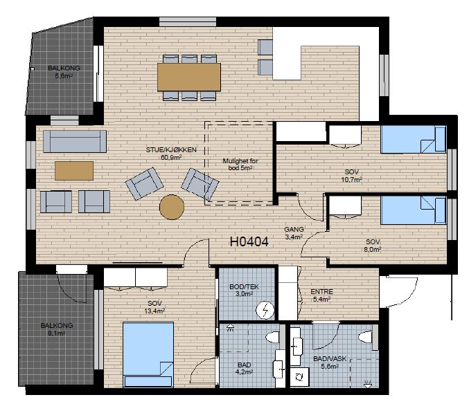 4-roms leilighet med en stue/kjøkkenløsning på hele 60 kvm. Mønt himling på stuen vil gi en fantastisk romfølelse! Utgang til to balkonger fra stuen - den ene mot vest og den andre mot nordvest. Utsikt mot Sørsundet, Kirklandet og det hyggelige fellesarealet. Leiligheten har 3 soverom - og hovedsoverommet har eget bad. Bad/vaskerom med inngang fra entre - slik som de to andre soverommene.