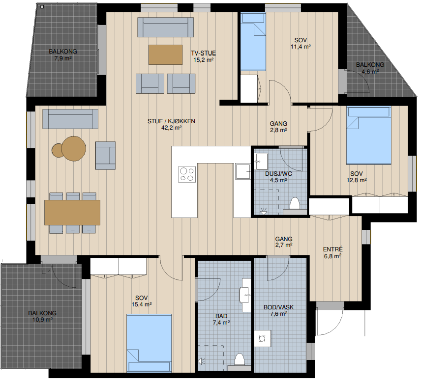 Her kan man nyte utsikten mot Kirklandet og havna! Leiligheten har hele tre balkonger - en med utgang fra stue, en fra tv-stue og en fra soverom. Dette er den største leiligheten i første byggetrinn, på hele 133 kvm BRA. Med 3 soverom, 2 bad, vaskerom og tv-stue - samt stue/kjøkkenløsning på ca 42 kvm - så kan nok leiligheten passe like godt for en familie - eller for et par som ønsker god plass. Man kan gå tørrskodd fra garasjeanlegget - via heisen - og inn til leiligheten.