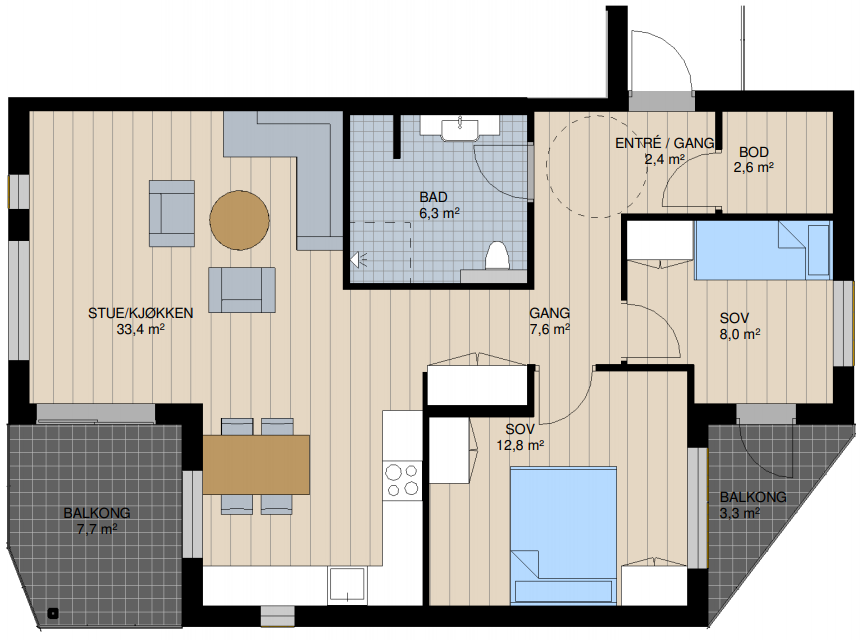 I tillegg til å kunne nyte borettslagets felles uteplasser, har man i denne leiligheten to balkonger - den ene med utgang fra stue og den andre fra soverom. Leiligheten har to soverom, romslig stue/kjøkken-løsning og kombinert bad/vaskerom.