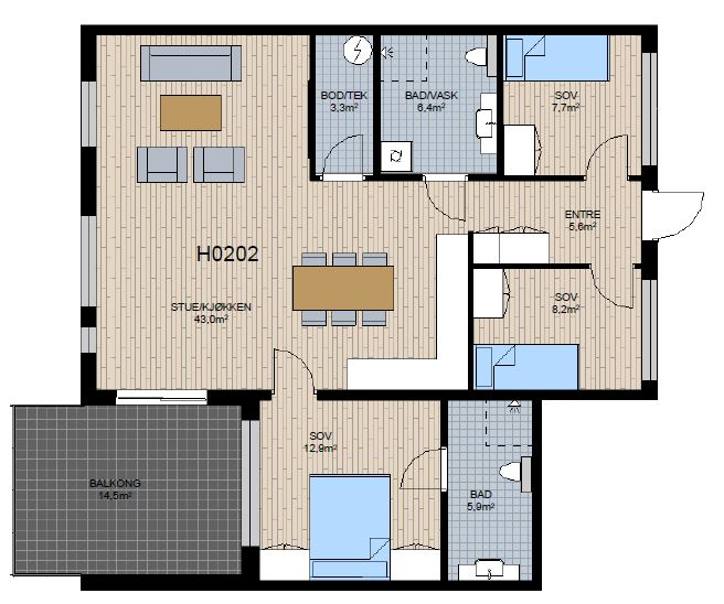 4-roms leilighet med vestvendt balkong. romslig stue- og kjøkkenløsning med utgang til balkong. Eget bad i tilknytning til hovedsoverommet - samt bad/vaskerom med inngang fra entre. Leiligheten har 3 soverom.