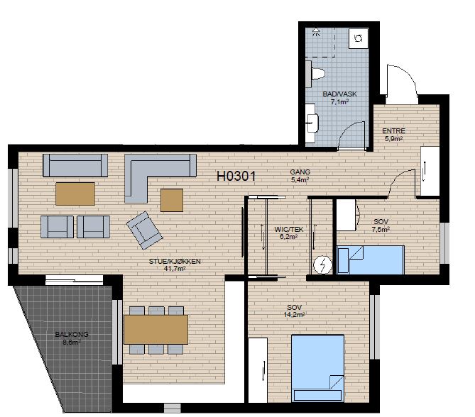 Romslig 3-roms leilighet med balkong mot sørvest. Stue/kjøkkenløsning på hele 45 kvm, med utgang til balkong og utsikt mot Sørsundet. "Walk-in-closet" i tilknytning til hovedsoverommet.